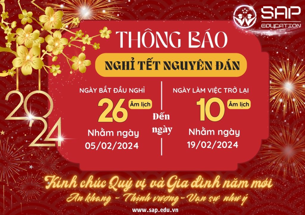 🎉Tết sắp chạm ngõ nhà nhà, trong không khí hân hoan chào đón năm mới – Tết Giáp Thìn 2024, Trung tâm Anh ngữ SAP gửi đến quý phụ huynh và học viên lịch nghỉ Tết Nguyên Đán như sau: